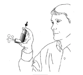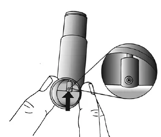 - Докато дишате дълбоко и бавно натиснете надолу в центъра на индикатора на дозата с пръст. Натиснете напълно върху кутията, докато спре да се движи в задвижването, докато доставя дозата ви.