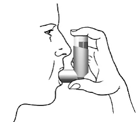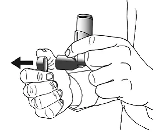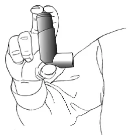 Извадете пръста си напълно от центъра на индикатора на дозата и извадете инхалатора от устата си. Вдишайте нежно. (Вижте Фигура F)