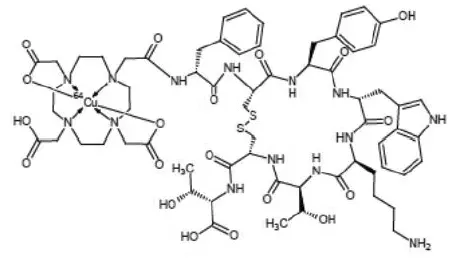 DetectNet съдържа меден Cu 64 Dotatate, който е радиоактивно диагностично лекарство за употреба с PET изображения. Chemically copper Cu 64 dotatate is described as copper (Cu 64)-N-[(4710-Tricarboxymethyl-14710- tetraazacyclododec-1-yl) acetyl]-Dphenylalanyl- L-cysteinyl-L-tyrosyl-D-tryptophanyl-L-lysyl-L- threoninyl-L-cysteinyl-L- threonine -cyclic (2-7) дисулфид. Молекулното тегло е 1497,2 далтони, а следното е структурната формула: