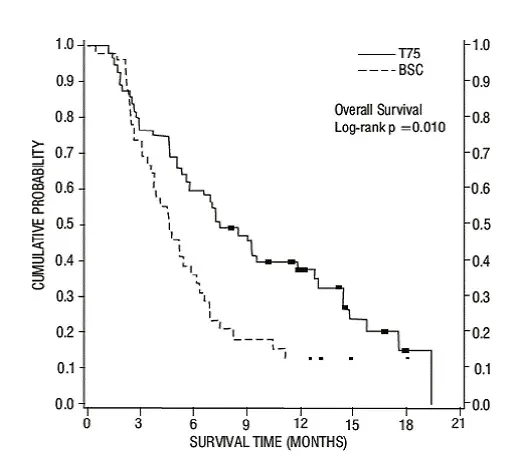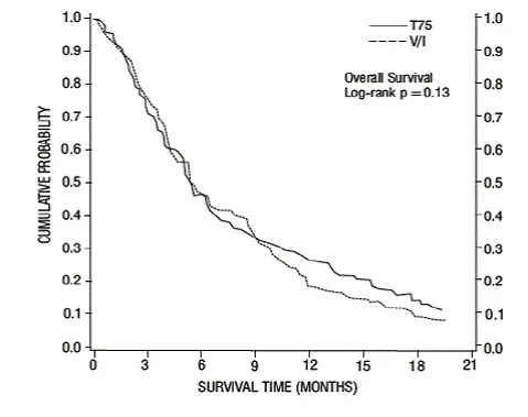 | Средна оцеляване (месеци) (95% там) | 18.6 (15.7 до 24) | 14.2 (11.5 до 18.7) |