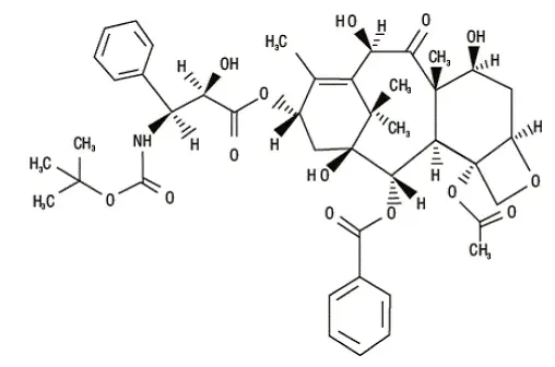 Docetaxel е антинеопластичен агент, принадлежащ към семейството на таксоида. Той се приготвя чрез полусинтеза, започвайки с предшественик, извлечен от биомасата на възобновяемата игла на растенията на тис. Химическото наименование за доцетаксел (безводен) е (2R3S) -N-карбокси-3-фенилизозеринен-TERT-бутилов естер 13-ester с 5β-20-епокси-12α47β10β13α-хексахидрокситакс-11-ен-9-един 4-ацетат 2-Benzoate. Доцетаксел (безводен) има следната структурна формула: