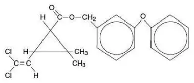 Използваният перметрин е приблизително 1: 3 смес от цис и транс изомери на пиретроидните 3- (22-дихлороенил) -2 2-диметилциклопропанекарбоксилна киселина (3-феноксифенил) метил естер. Перметринът има молекулна формула на c 21 H 20 Там 2 O 3 и молекулно тегло 391.29. Това е жълто до светло оранжево-кафяво ниско разтопяващо се твърдо вещество или вискозна течност.