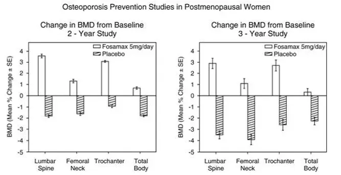 Предотвратяването на костна загуба е демонстрирана в две двойно-слепи плацебо-контролирани проучвания на жени след менопауза на възраст 40-60 години. Хиляда шестстотин девет пациенти (Fosamax 5 mg/ден; n = 498), които са били поне шест месеца след менопауза, са били вписани в двугодишно проучване, без да се вземат предвид основната им BMD. В другото проучване 447 пациенти (Fosamax 5 mg/ден; n = 88), които са били между шест месеца и три години след менопаузата, са лекувани до три години. При лекуваните с плацебо пациенти загубите на BMD от приблизително 1% годишно са наблюдавани в тазобедрената става (шийката на бедрената кост и трохантера) и общото тяло. За разлика от това Fosamax 5 mg/ден предотвратява загубата на кост при по -голямата част от пациентите и предизвиква значително увеличение на средната кост на кост на всяко от тези места (виж фигура 4). В допълнение Fosamax 5 mg/ден намалява скоростта на загуба на кост в предмишницата с приблизително половината от плацебо. Fosamax 5 mg/ден беше подобно ефективен при тази популация, независимо от възрастовото време след състезанието на менопаузата и базовия процент на костния оборот.