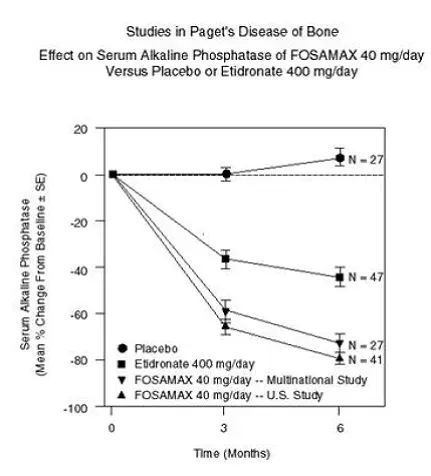 Ефикасността на Fosamax 40 mg веднъж дневно в продължение на шест месеца е демонстрирана при две двойно-слепи клинични проучвания на пациенти от мъже и жени с умерена до тежка болест на Paget (алкална фосфатаза поне два пъти по-голяма от горната граница на нормалното): плацебо-контролирано мултинационално проучване и сравнително проучване в САЩ с етидронатно дезодий 400 mg/ден. Фигура 6 показва средните процентни промени от изходното ниво в серумната алкална фосфатаза за до шест месеца рандомизирано лечение.