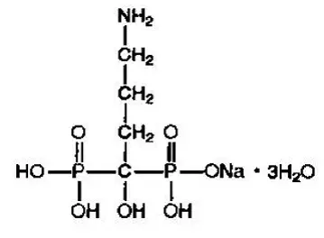 Емпиричната формула на алендронат натрий е c 4 H 12 Nnao 7 P 2 • 3h 2 O и теглото му на формулата е 325.12. Структурната формула е:
