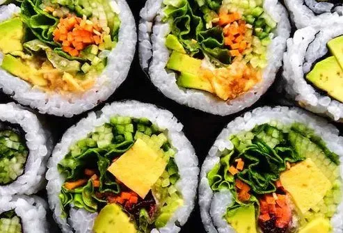 Много популярни суши рулца включват авокадо често с риба и зеленчуци, но понякога сами с ориза (и обвивката на морски водорасли на Нори). Авокадото е с високо съдържание на здравословни мазнини и фибри и е пълен с други хранителни вещества. Това може да помогне на бъбреците ви сърцето ви и нервите ви да работят по -добре.