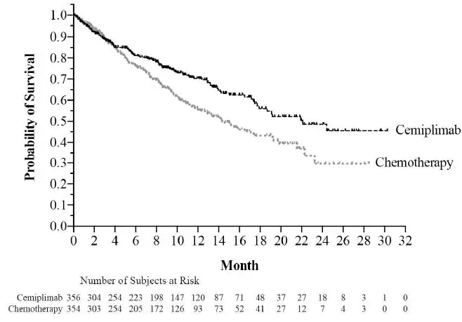 Лечението с Libtayo продължи до Recist 1.1 дефинирана прогресираща болест неприемлива токсичност или до 108 седмици. Пациентите, които са имали оценка на IRC, RECIST 1.1-дефинирано прогресиращо заболяване на терапията с Libtayo, са били разрешени да продължат лечението с libtayo (до допълнителни 108 седмици) с добавяне на 4 цикъла на специфична за хистоотерапията химиотерапия до по-нататъшна прогресия. От 203 пациенти, рандомизирани да получават химиотерапия, които са оценили IRC, RECIST 1,1-дефинирана болест прогресия 150 (74%) пациенти, преминали към лечение с Libtayo. Оценката на туморния статус се извършва на всеки 9 седмици. Основните мерки за резултатите от ефикасността бяха цялостната преживяемост (ОС) и преживяемостта без прогресия (PFS). Допълнителна мярка за резултатите от ефикасността беше общата степен на отговор (ORR).