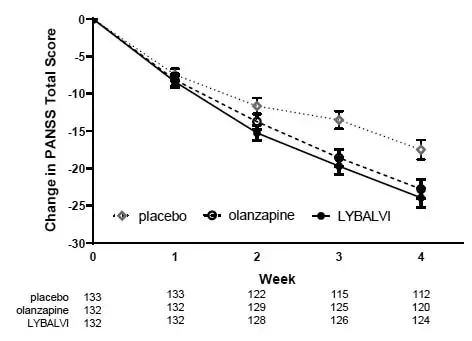 В сравнение с пациентите при плацебо се наблюдава статистически значимо подобрение на CGI-S резултат на 4-та седмица при пациенти, лекувани с Lybalvi.