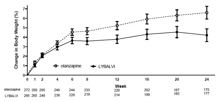 Лечението с Lybalvi е свързано със статистически значително по -малко наддаване на тегло от лечението с оланзапин и с по -малък дял от пациентите, които са получили ≥10% телесно тегло (Таблица 8). Фигура 5 показва процента на промяна в телесното тегло с течение на времето.