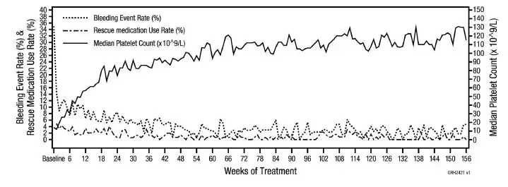 Резултатите от проучване 1 и 2 са показани в таблица 5. Устойчив отговор на тромбоцитите е постигането на седмичен брой на тромбоцитите ≥ 50 x 10 9 /L за всеки 6 от последните 8 седмици от 24-седмичния период на лечение при липса на спасителни лекарства по всяко време. Преходната реакция на тромбоцитите беше постигането на всяка седмична броя на тромбоцитите ≥ 50 x 10 9 /L за 4 седмици по време на периода на лечение без трайна реакция на тромбоцитите. Общата реакция на тромбоцитите беше постигането на трайна или преходна реакция на тромбоцитите. Отговорите на тромбоцитите бяха изключени в продължение на 8 седмици след получаване на спасителни лекарства.