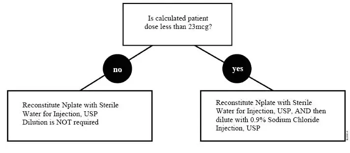 Първоначалната доза на NPLATE е 1 mcg/kg. Действителното телесно тегло при започване на лечението винаги трябва да се използва при изчисляване на първоначалната доза. При възрастни бъдещите корекции на дозата се основават само на промените в броя на тромбоцитите.