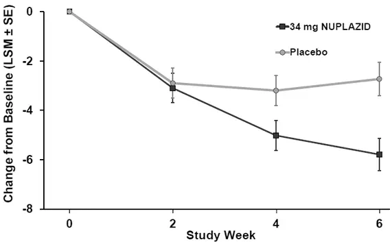 Ефектът на Nuplazid върху SAPS-PD се подобри през шестседмичния пробен период, както е показано на фигура 3.