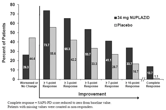 Както е показано в таблица 3 Фигура 3 и Фигура 4 Nuplazid 34 mg (n = 95) са статистически значително по-добри от плацебо (n = 90) при намаляване на честотата и/или тежестта на халюцинациите и заблудите при пациенти с PDP, измерени от централни независими и заслепени рацери, използвайки SAPS-PD скалата. Ефект се наблюдава както върху халюцинациите, така и върху компонентите на заблудите на SAPS-PD.
