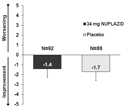 Nuplaz 34 mg did not show an effect compared to placebo on motor function as measured using the Unified Parkinson’s Disease Rating Scale Parts II и III (UPDRS Parts II+III) (Figure 5). A negative change in score indicates improvement. The UPDRS Parts II+III was used to assess the patient’s Parkinson’s disease state during the 6-week double-blind treatment period. The UPDRS score was calculated as the sum of the 40 items from activities of daily living и motor examination with a range of 0 to 160.