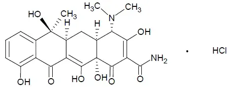 Тетрациклиновият хидрохлорид е жълт кристален прах без мирис. Тетрациклиновият хидрохлорид е стабилен във въздуха, но излагането на силна слънчева светлина го кара да потъмнява. Тетрациклин хидрохлорид е (4S4AS5AS6S12AS) -4- (диметиламино) -144a55a61112a-octahydro36101212a-penta-hydroxy-6-methyl-111-диоксо-2-naphththathacenecarboxamide 22 H 24 N 2 O 8 • HCl и следната структурна формула: