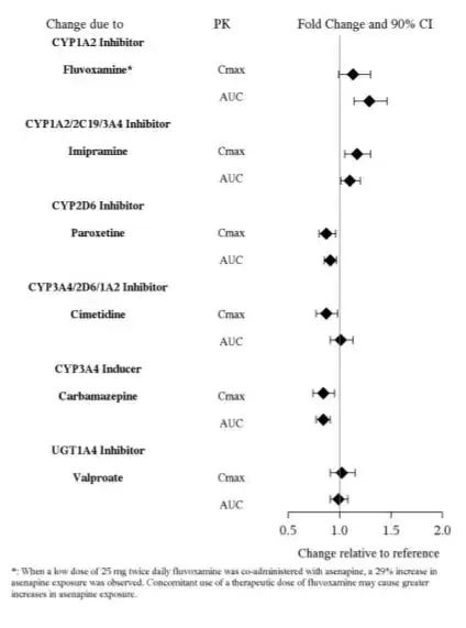 Ефектите на други лекарства върху излагането на асенапин са обобщени на фигура 1. В допълнение, фармакокинетичен анализ на популацията показва, че съпътстващото приложение на литий не оказва влияние върху фармакокинетиката на асенапин.