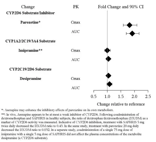 Коадминацията на пароксетин със Saphris предизвика двукратно увеличение на максималните плазмени концентрации и системната експозиция на пароксетин. Асенапинът засилва инхибиторните ефекти на пароксетин върху собствения му метаболизъм от CYP2D6.