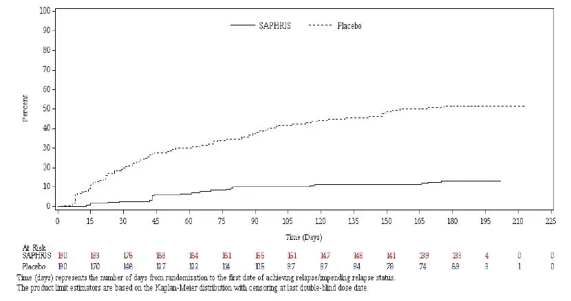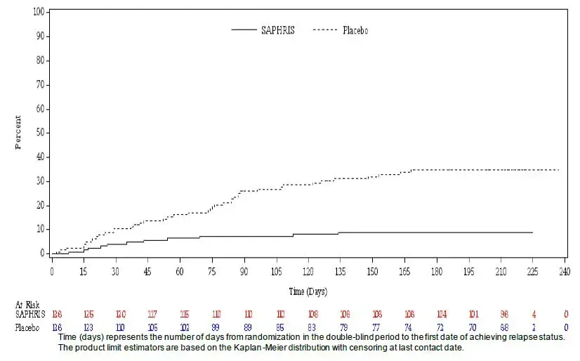 Поддържането на ефикасността е демонстрирано в плацебо-контролирана двойно-сляпа многоцентрова гъвкава доза (5 mg или 10 mg два пъти дневно на базата на поносимост) клинично изпитване с рандомизиран дизайн на оттегляне. Първоначално всички пациенти са били прилагани 5 mg два пъти дневно в продължение на 1 седмица и след това са титрирани до 10 mg два пъти дневно. Общо 700 пациенти са влезли в лечение с отворен етикет със SAPHRI за период от 26 седмици. От тях общо 386 пациенти, които отговарят на предварително определени критерии за продължителна стабилност (средната дължина на стабилизацията е 22 седмици), са рандомизирани на двойно сляпо плацебо-контролирана рандомизирана фаза на оттегляне. SAPHRIS was statistically superior to placebo in time to relapse or impending relapse defined as increase in PANSS ≥20% from baseline and a Clinical Global Impression Severity of Illness (CGI-S) score ≥4 (at least 2 days within 1 week) or PANSS score ≥5 on hostility or uncooperativeness items and CGI-S score ≥4 (≥2 days within a week) or PANSS score ≥5 on any two of Следните елементи: Необичайно мислено съдържание Концептуална дезорганизация или халюцинаторно поведение и CGI-S оценка ≥4 (≥2 дни в рамките на 1 седмица) или преценка на изследователя за влошаващи се симптоми или повишен риск от насилие до себе си (включително самоубийство) или други лица. Кривите на Kaplan-Meier от времето за рецидив или предстоящ рецидив по време на двойно сляпо плацебо-контролирана рандомизирана фаза на оттегляне на това изпитване за SAPHRIS и плацебо са показани на фигура 4.