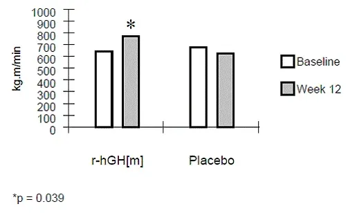 Средната максимална работна мощност до изчерпването се увеличи след 12 седмици с 2,57 килоджули (KJ) в серостим 0,1 mg/kg дневна група (p <0.01) and by 2.53 kJ in the Серостим 0.1 mg/kg every other day group (p <0.01) compared with placebo (Table 4). Cycle work output improved approximately 9% in both active treatment arms and decreased <1% in the placebo group. Lean body mass (LBM) and body weight (BW) increased and fat mass decreased in a dose-related fashion after treatment with Серостимand placebo (Table 5). The LBM results obtained by BIS were confirmed with DXA.