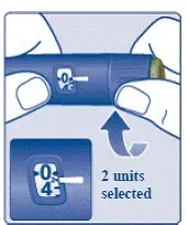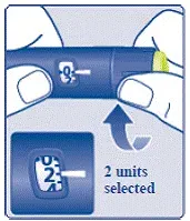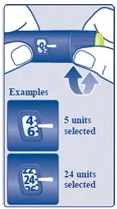 - Превърнете селектора на дозата в select the number of units you need to inject. Дозата показалец трябва да се подрежда с вашата доза (виж Фигура К. ).