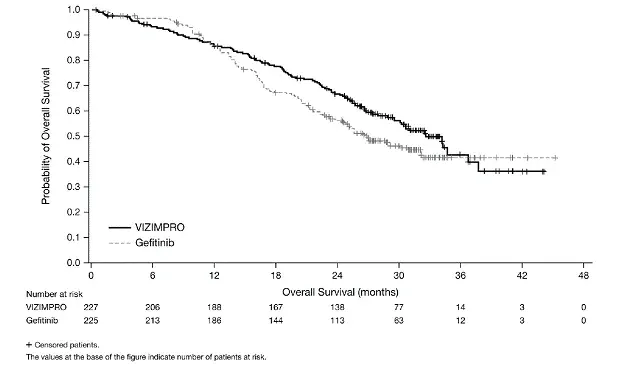 Общо 452 пациенти са рандомизирани за получаване на vizimpro (n = 227) или гефитиниб (n = 225). Демографските характеристики са били 60% жени; средна възраст 62 години (диапазон: 28 до 87) с 40% на възраст 65 години и повече; и 23% бели 77% азиатски и по -малко от 1% черно. Прогностичните и туморните характеристики са състоянието на ефективността на ECOG 0 (30%) или 1 (70%); 59% с делеция на екзон 19 и 41% с екзон 21 L858R заместване; Етап IIIB (8%) и етап IV (92%); 64% никога не са били пушачи; и 1% са получавали предварително адювант или неоадювантна терапия.